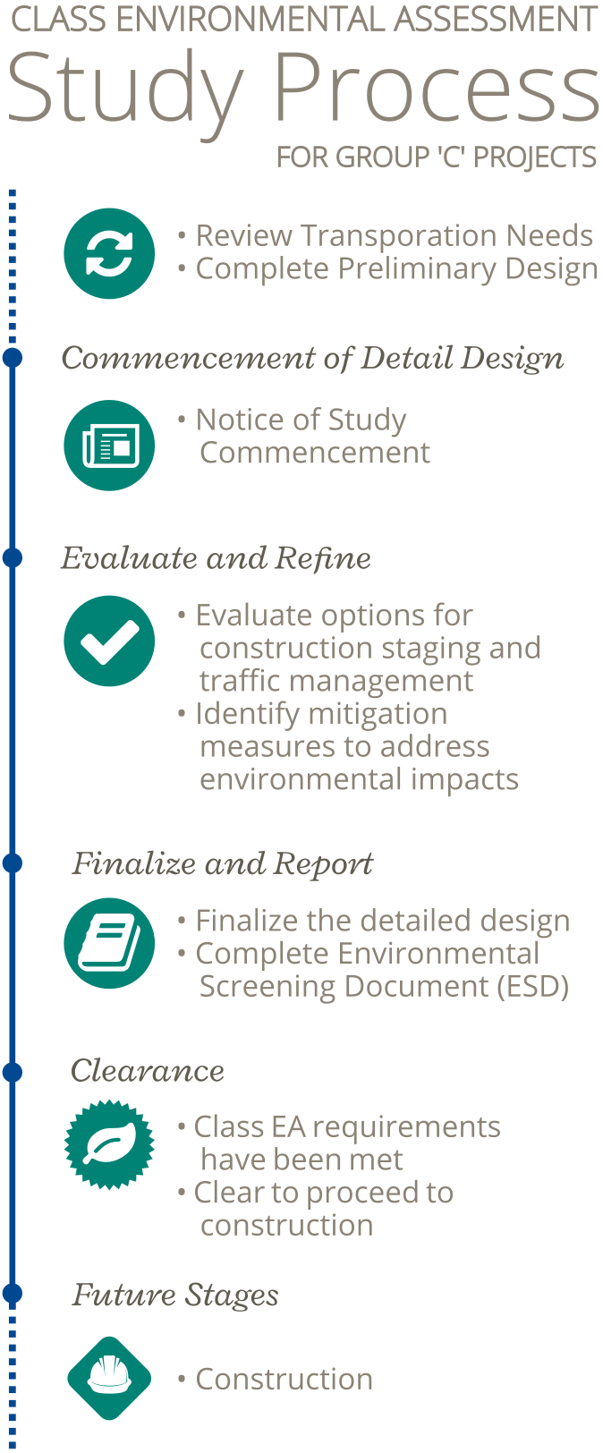 Group ‘C’ projects include improvements to service, maintenance, and operations for existing provincial transportation facilities that do not involve major footprint impacts, or significant increases to traffic and/or truck layover capacity. Group ‘C’ projects are considered approved under the Ontario Environmental Assessment Act, subject to compliance with the Class EA and the application of mitigation measures where necessary. An Environmental Screening Document (ESD) fulfills the documentation requirements of the Class EA process for a Group ‘C’ project. The ESD will be filed with the MTO for their records at the end of the Detail Design study. There is no formal review period for the ESD.